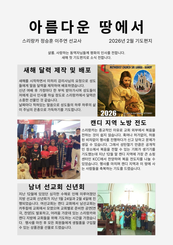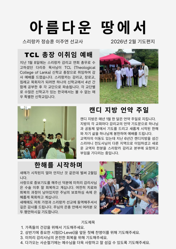 2026 2월 스리랑카 (정승훈,이주연 선교사) 선교편지 페이지 정보 최고관리자 작성일 26-02-11 15:33 53 0 본문 첨부파일 25년 아름다운 땅에서스리랑카.pdf (1.1M) 25회 다운 26년 아름다운 땅에서.pdf (1.5M) 28회 다운