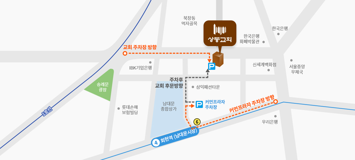 상동빌딩 주차안내 - 교회 정문 옆에 상동빌딩 지하 주차장 입구가 있습니다. 주차장 입구로 들어오시면 새가족을 위한 주차공간이 마련되어 있습니다. - SUV차량은 지하 3층에 주차가 가능합니다. - 주차하신 후에는 후문에 위치한 엘리베이터를 타시고 7층으로 올라오시면, 8층 예배실로 안내해드립니다. - 7층 교회 사무실에 차량을 등록신청을 하시면 무료로 주차를 이용하실 수 있으며, 필요에 따라 일일 주차권을 드립니다. 커먼프라자 주차안내 - 상동빌딩 교회주차장이 만차일 경우, 주일(일요일)에는 회현역 6번 출구 앞에 위치한 커먼프라자 상가건물 주차장에 주차하실 수 있습니다. - 예배를 마치신 후에 상동교회 7층 교회사무실에서 일일주차권을 드립니다. - 월요일부터 토요일까지는 주차하실 수 없습니다. |