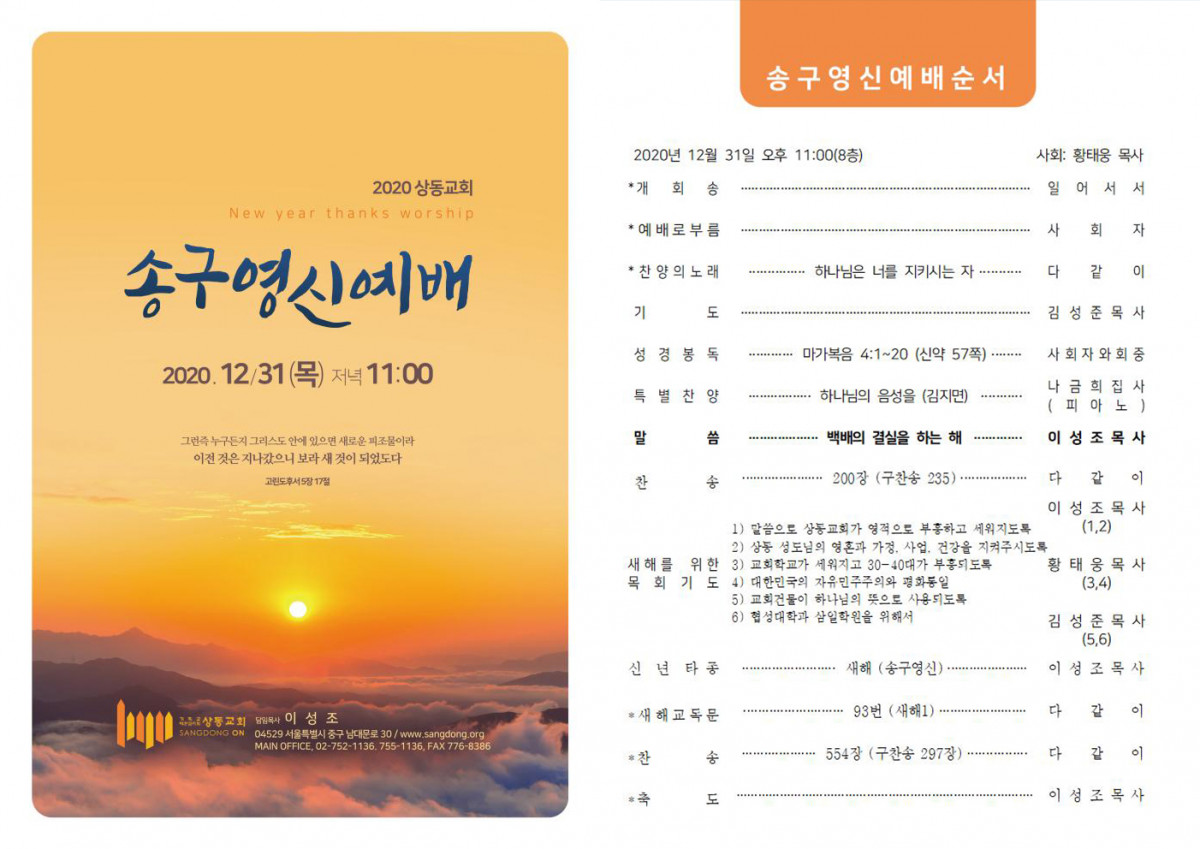 ⦁온라인 송구영신예배: 오늘(31일) 밤11시, 8층 대예배당