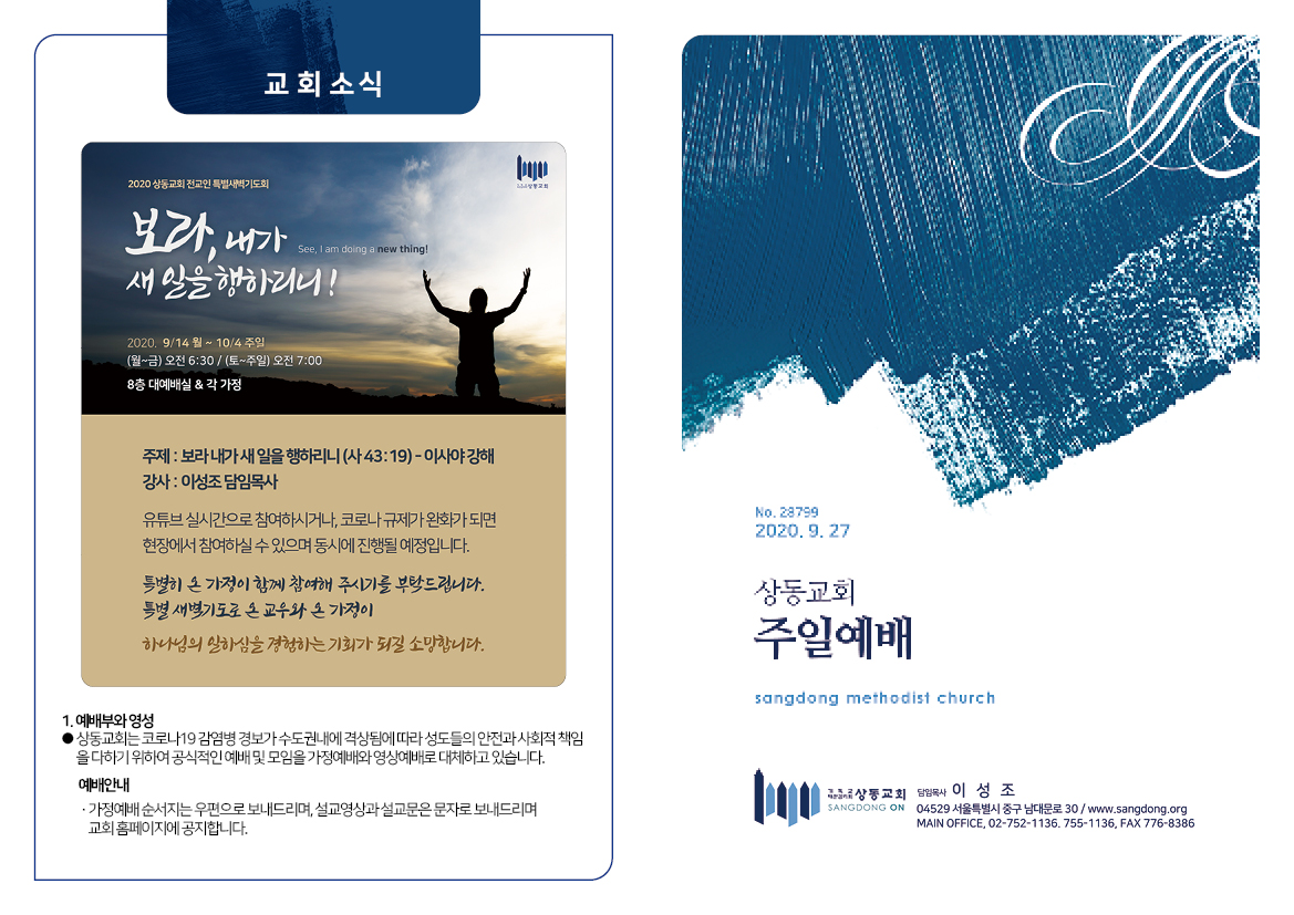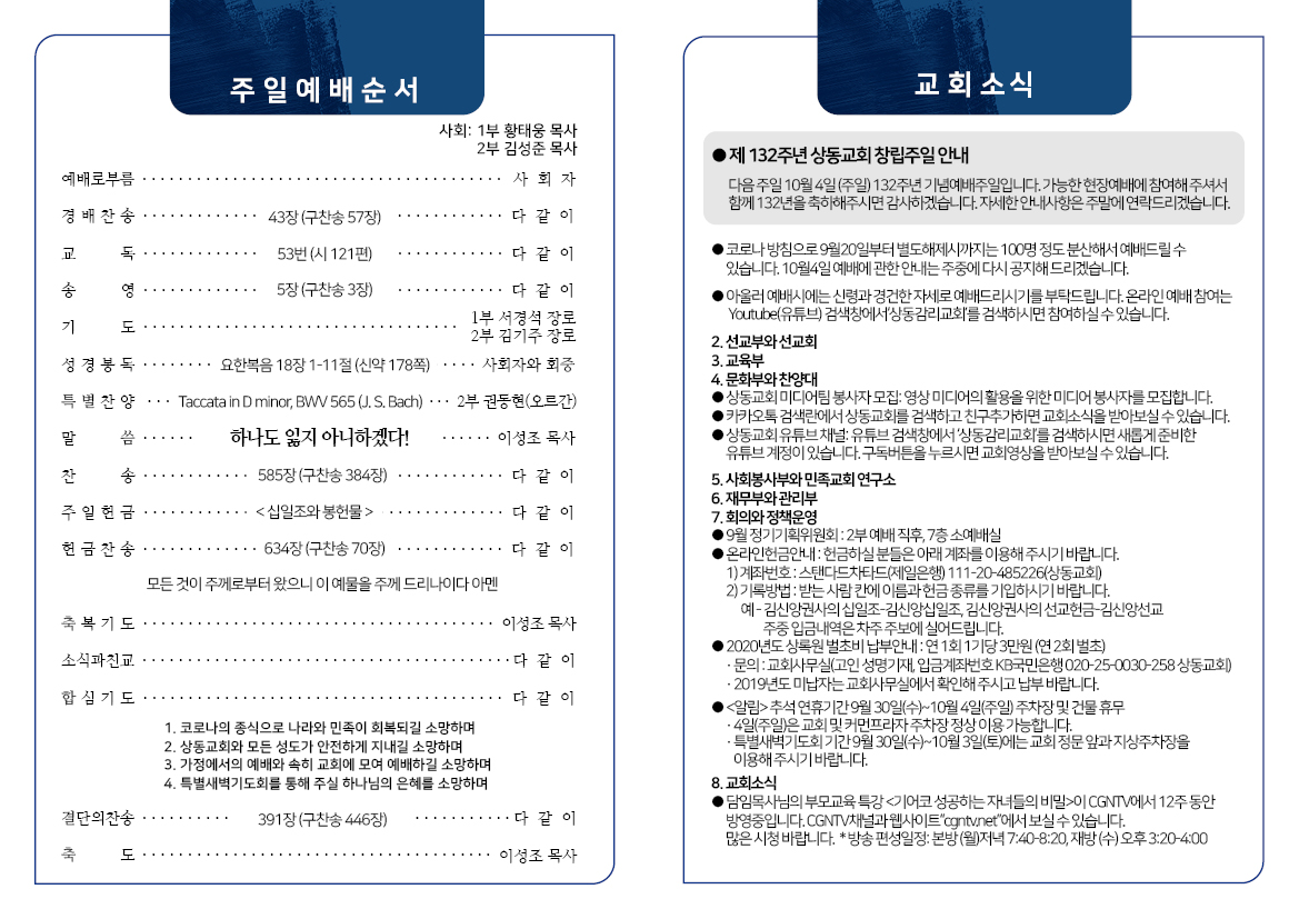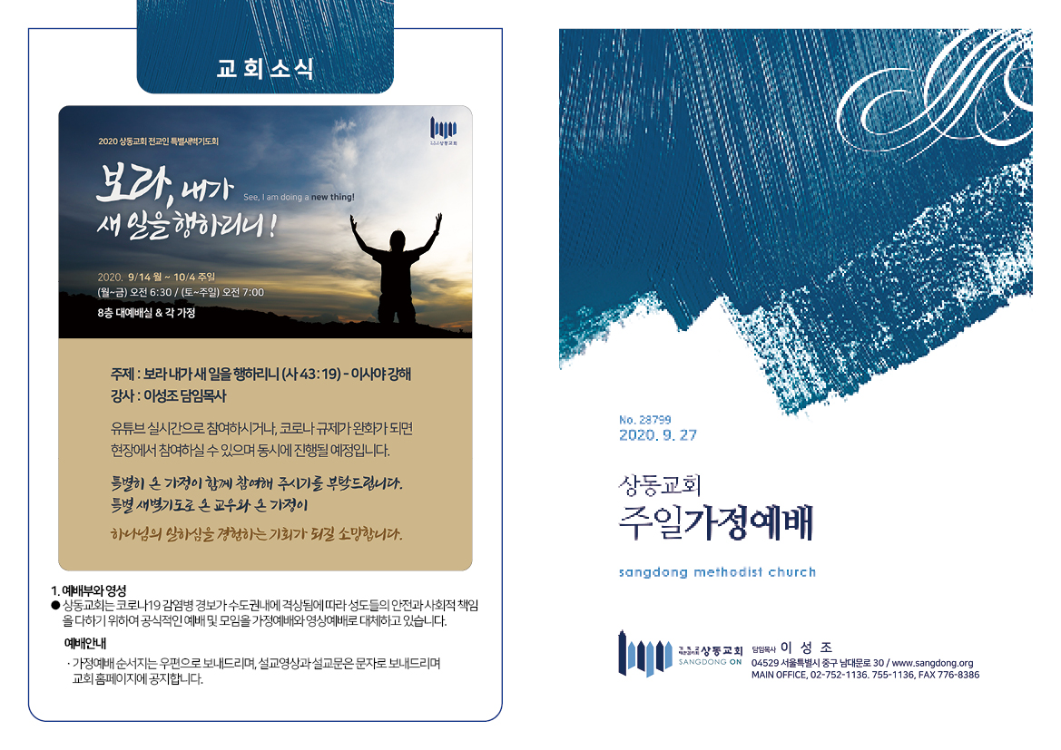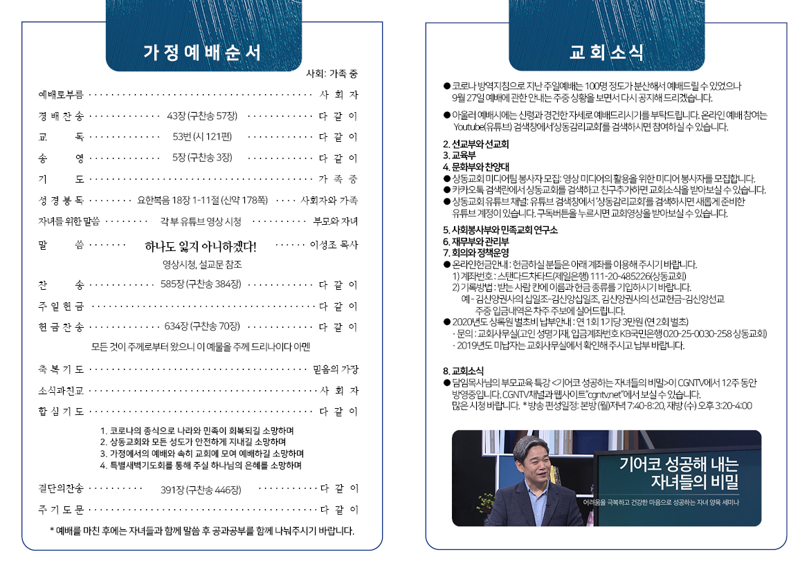 [20년 9월 27일] 가정예배문 페이지 정보 관리자 작성일 20-09-26 08:05 4,338 0 본문 첨부파일 0927_가정예배서.pdf (2.2M) 3479회 다운 0927_주일예배서_최종.pdf (2.1M) 3464회 다운 헌금자명단.hwp (20.0K) 3307회 다운 .