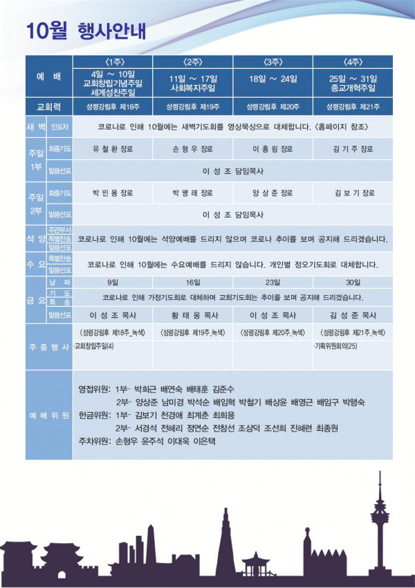 2020년 10월 행사안내 페이지 정보 작성일 20-09-30 07:47 2,807 0 본문 코로나 방역지침에 따라 일정이 달라질수 있습니다. 코로나 추이를 보면서 변경사항이 있게 되면 다시 올려드리겠습니다.