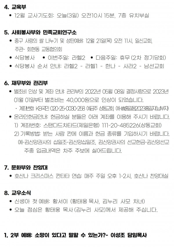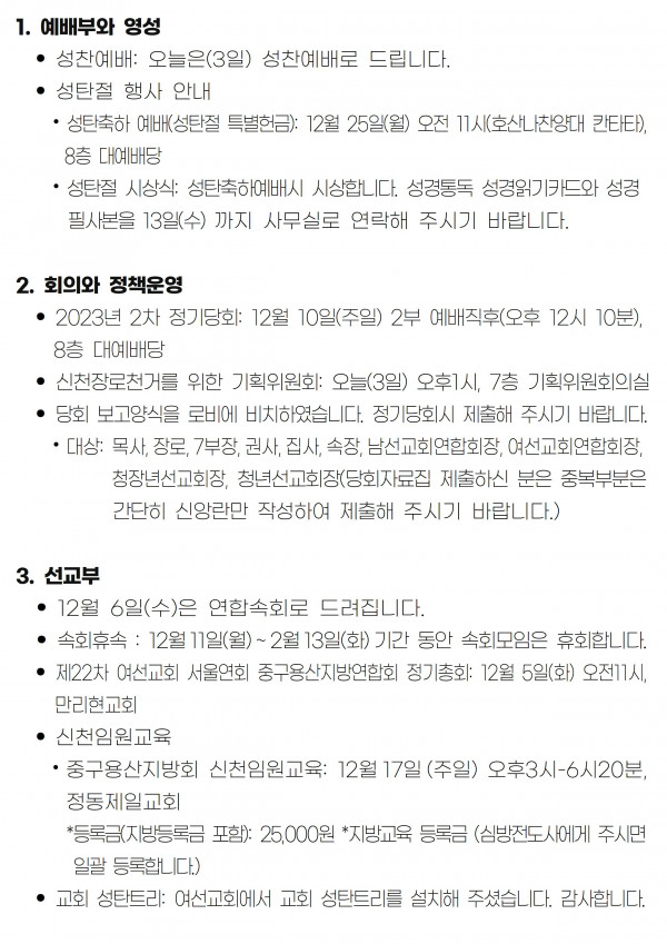 [2023년 12월 3일 교회소식] 페이지 정보 최고관리자 작성일 23-12-01 19:21 1,192 0 본문 첨부파일 12-3표지.pdf (327.6K) 675회 다운 12-3별지.hwp (24.5K) 684회 다운