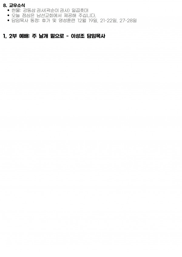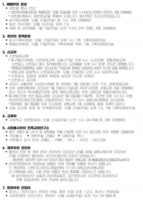 [2023년 12월 17일 교회소식] 페이지 정보 최고관리자 작성일 23-12-15 19:09 1,211 0 본문 첨부파일 12-17표지.pdf (330.4K) 669회 다운 12-17별지.hwp (24.0K) 655회 다운