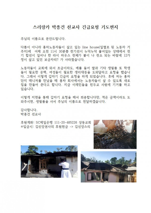 스리랑카 박종건 선교사 긴급요청 기도편지