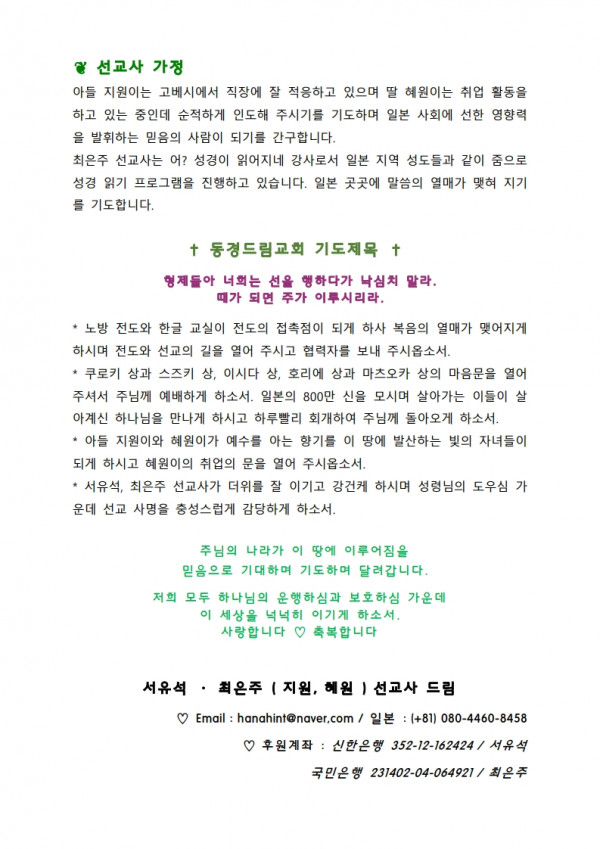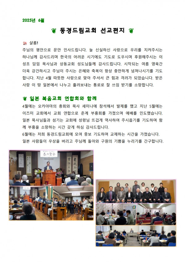 2025 6월 동경드림교회 선교편지(서유석,최은주 선교사) 페이지 정보 최고관리자 작성일 25-07-16 10:11 187 0 본문 첨부파일 동경드림교회 2025년 6월 선교편지.pdf (4.2M) 113회 다운