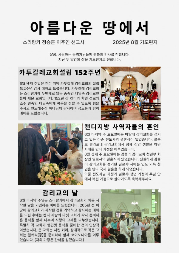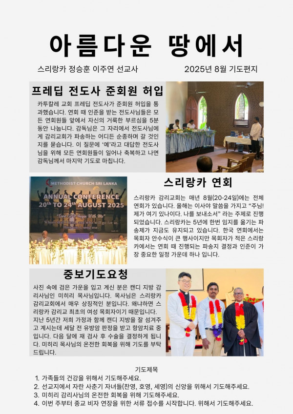 2025 8월 스리랑카 (정승훈 이주연 선교사) 선교편지 페이지 정보 최고관리자 작성일 25-08-27 17:01 123 0 본문 첨부파일 25년 아름다운 땅에서 1.pdf (1.7M) 65회 다운