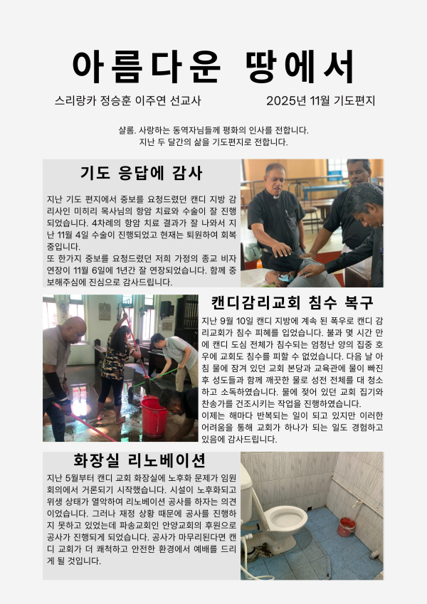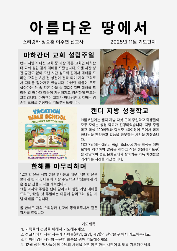 2025 11월 스리랑카 (정승훈 이주연 선교사) 선교편지 페이지 정보 최고관리자 작성일 25-11-21 18:38 233 0 본문 첨부파일 25년 아름다운 땅에서스리랑카.pdf (1.1M) 113회 다운